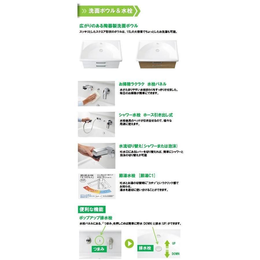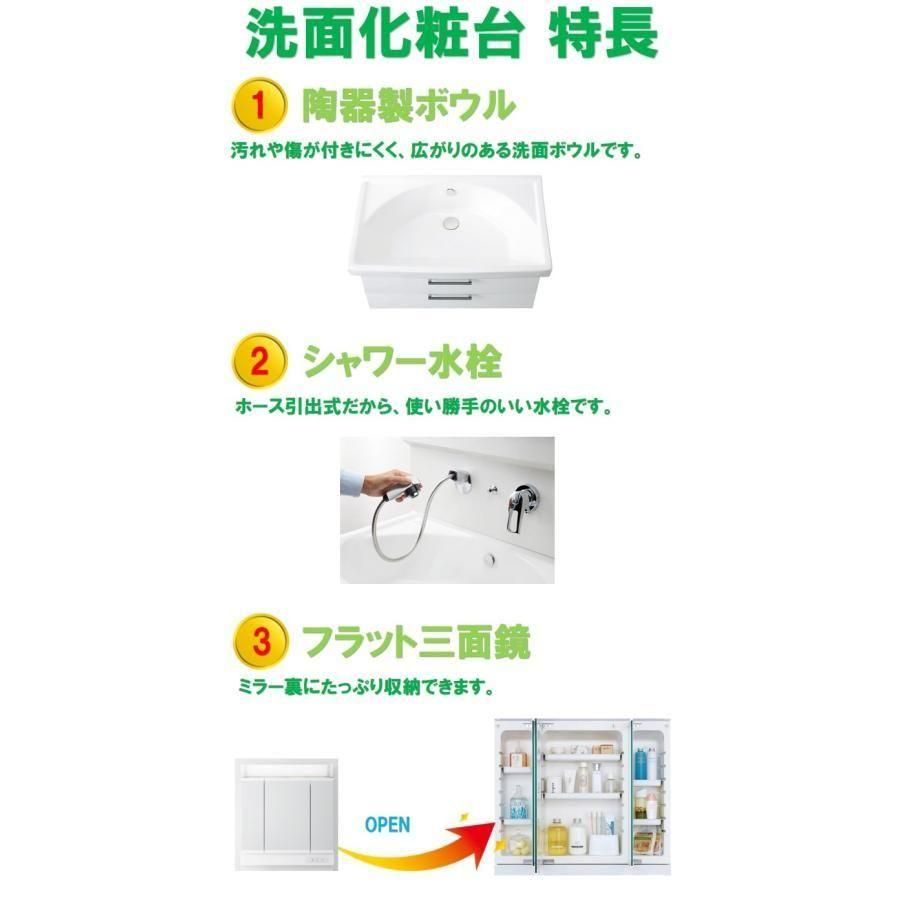 | 保証について | 洗面台・水栓:2年 化粧鏡:1年 ※保証内容はメーカー規約に準ます。 |