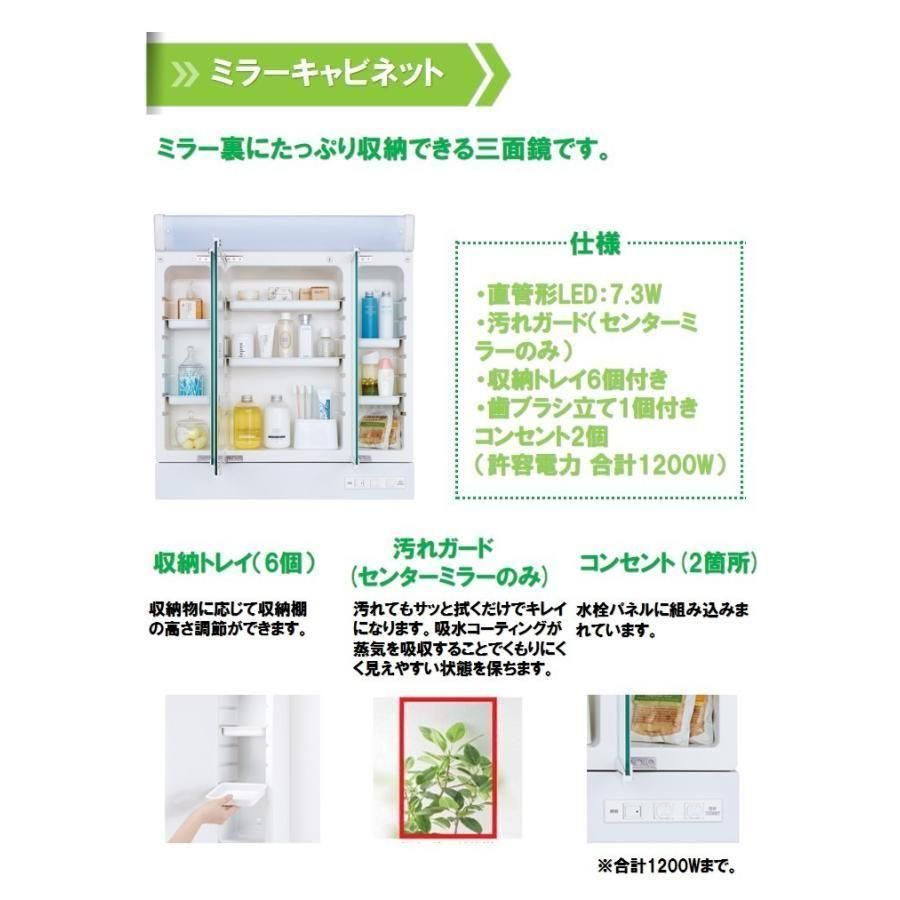 | ミラーキャビネット主な仕様 | 直管形LED:7.3W 汚れガード(センターミラーのみ) 収納トレイ6個付き 歯ブラシ立て1個付き コンセント2個(1200Wまで) |